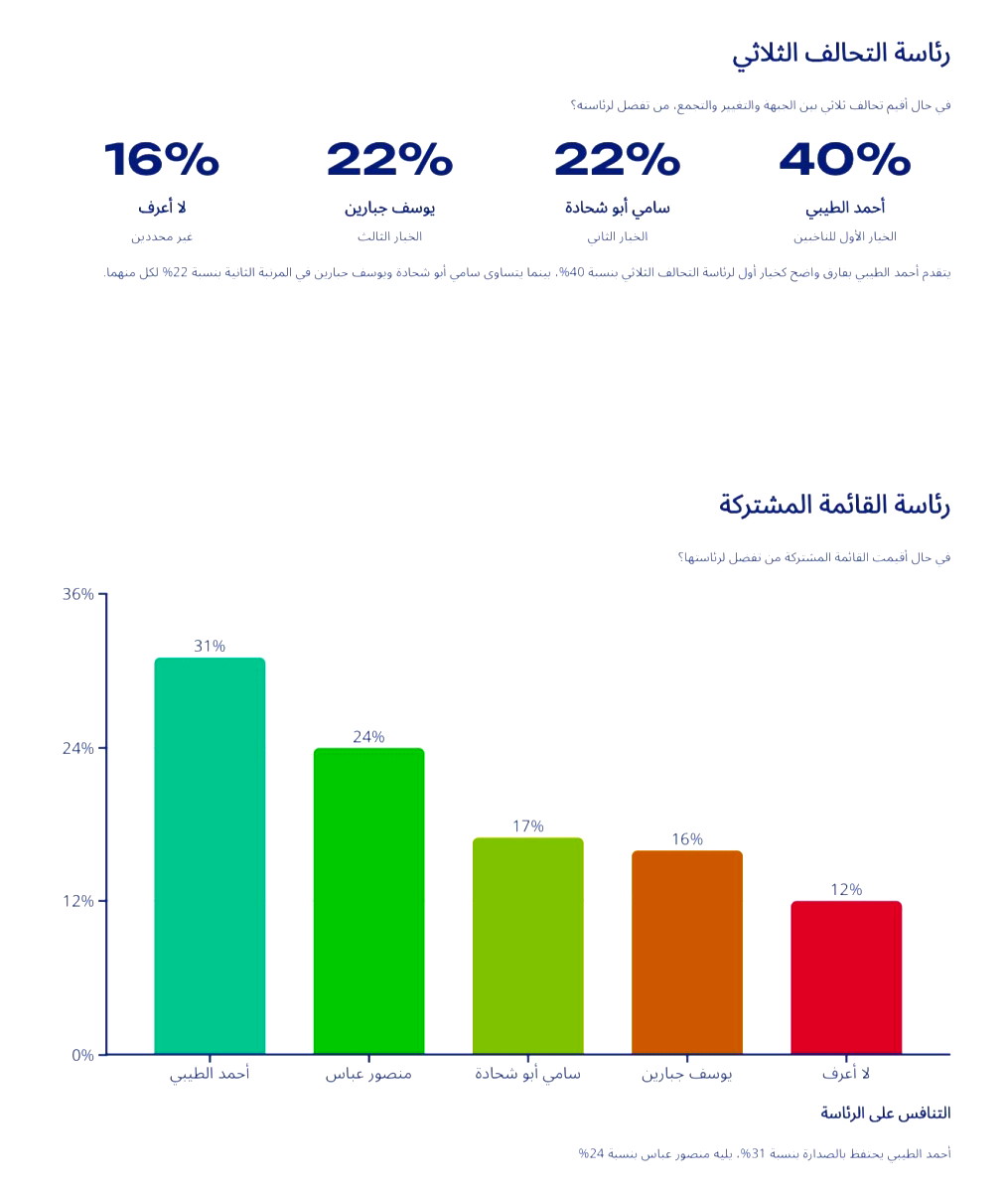 كذلك حول رئاسة المشتركة حاز النائب احمد الطيبي على المرتبة الاولى ٣١٪ بينما منصور عباس على ٢٤٪ وسامي ابو شحادة ١٧٪ بينما حاز يوسف جبارين على المرتبة الاخيرة ب١٦٪ فقط.