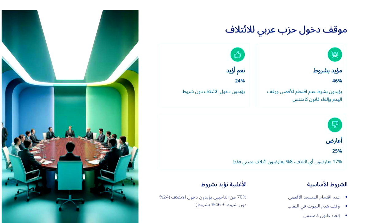 كما اظهر الاستطلاع معطيات هامة حول مدى تأييد دخول الائتلاف الحكومي . حيث قال ٢٤٪ انهن يؤيدون دخول الائتلاف بلا شروط بينما اظهر الاستطلاع ان ٤٦٪ يؤيدون بشروط واضحه: وقف اقتحامات المسجد الاقصى، وقف هدم البيوت والغاء قانون كمينتس. بينما قال ٢٥٪ انهم يرفضون دخول الائتلاف .