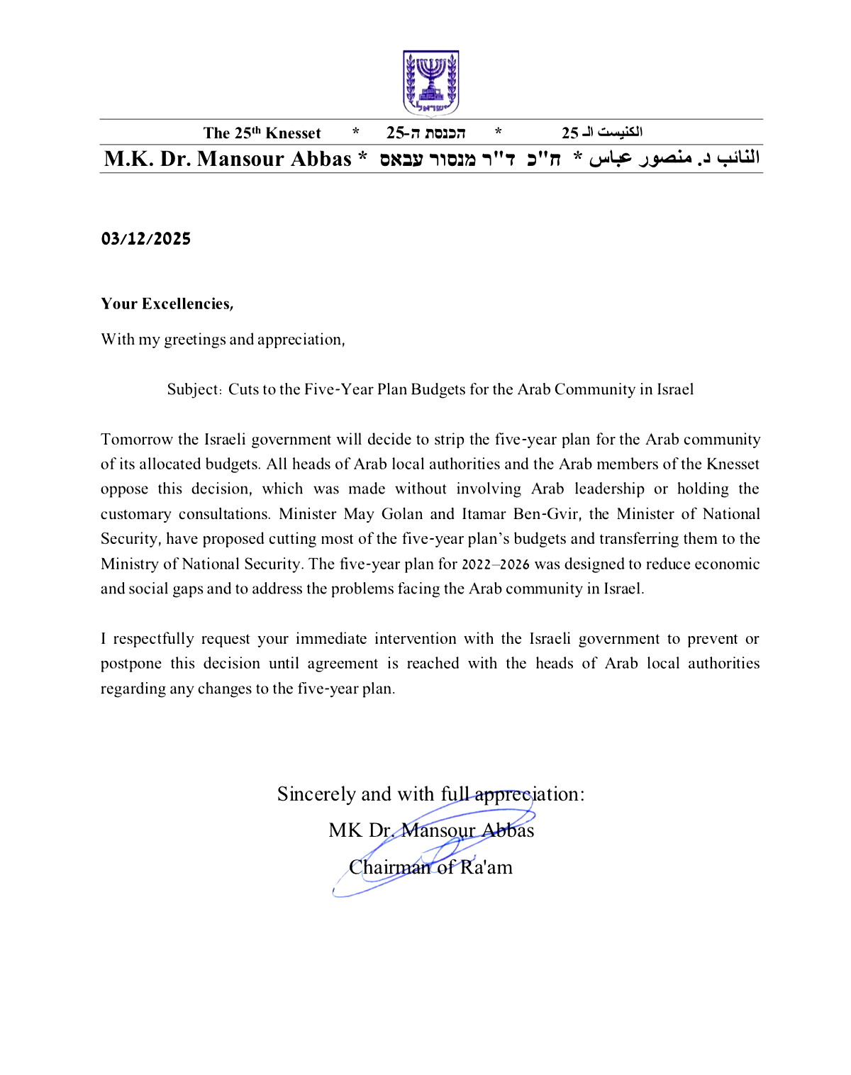 توجّه النائب د. منصور عباس، رئيس القائمة العربية الموحّدة، برسائل رسمية إلى عدد من السفارات والبعثات الدبلوماسية في تل أبيب، طالب فيها بالتدخل العاجل لمنع الحكومة الإسرائيلية من إلغاء ميزانيات الخطة الخمسية "تقدّم- 550" المخصّصة للمجتمع العربي.