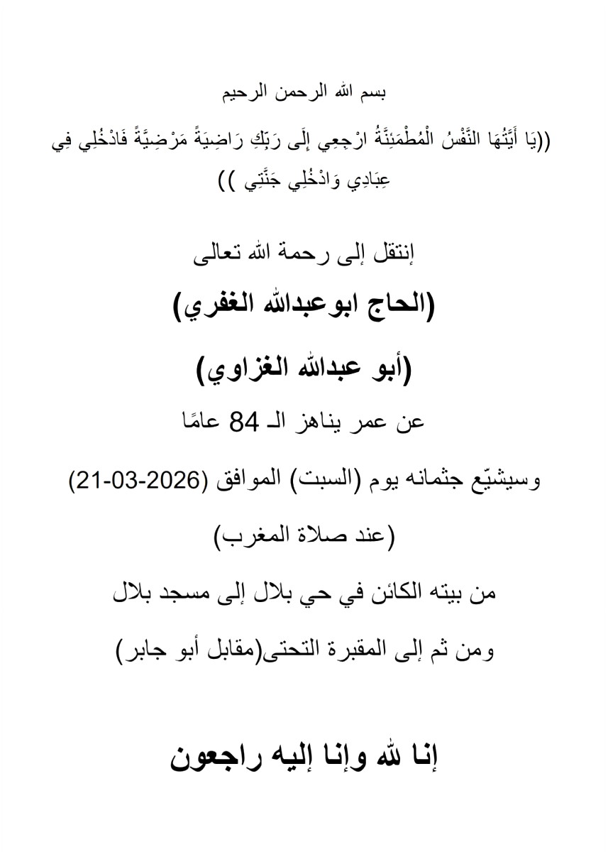 انتقل إلى رحمة الله تعالى الحاج أبو عبدالله الغفري (المعروف بـ أبو عبدالله الغزاوي)، عن عمر يناهز 84 عاماً.